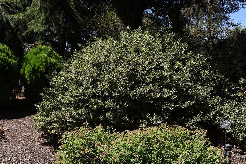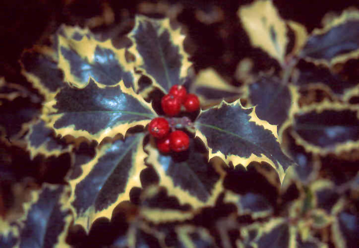Deep blue-green leaves are bordered by a wide creamy-white margin which changes to pink in fall; lustrous red berries compliment the foliage and persist into winter; has proved to be very winter hardy
