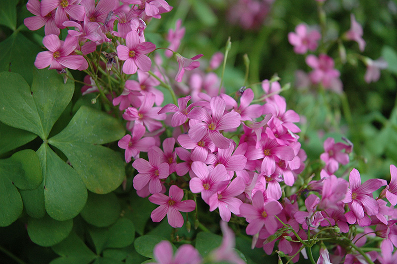 Pink Wood Sorrel will grow to be only 6 inches tall at maturity extending to 8 inches tall with the flowers, with a spread of 12 inches. When grown in masses or used as a bedding plant, individual plants should be spaced approximately 10 inches apart. Its foliage tends to remain low and dense right to the ground. It grows at a medium rate, and under ideal conditions can be expected to live for approximately 10 years. As an herbaceous perennial, this plant will usually die back to the crown each winter, and will regrow from the base each spring. Be careful not to disturb the crown in late winter when it may not be readily seen!