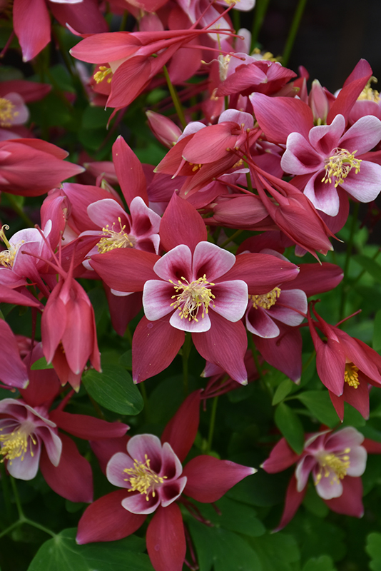 Winky Red And White Columbine features showy double red bell-shaped flowers with white overtones and buttery yellow eyes at the ends of the stems from late spring to early summer, which emerge from distinctive burgundy flower buds. The flowers are excellent for cutting. Its lobed compound leaves remain green in color throughout the season.