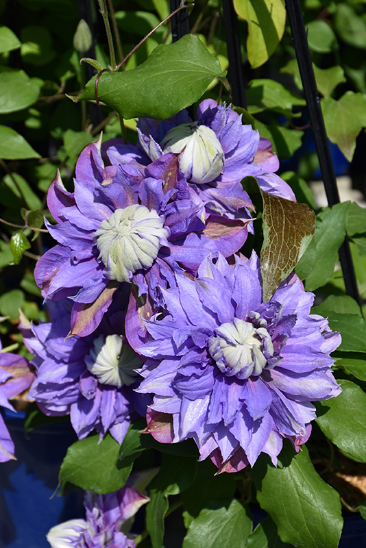 Diamantina Clematis is covered in stunning fully double violet round flowers with blue overtones and white eyes at the ends of the branches from late spring to early fall. It has dark green deciduous foliage. The compound leaves do not develop any appreciable fall color.