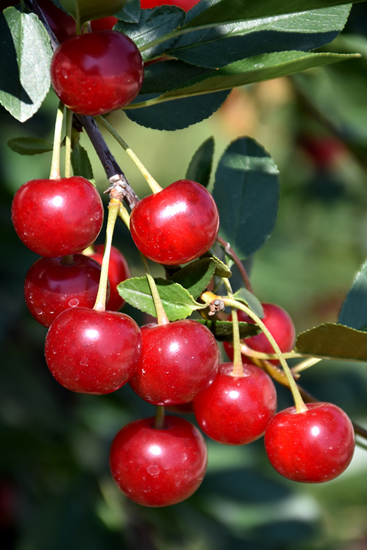 A compact fruit tree, the ideal size for backyard orchards; showy white flowers in spring followed by loads of bright red sour cherries in mid summer, excellent for pies and jam; needs full sun and well-drained soil, self-pollinating and hardy