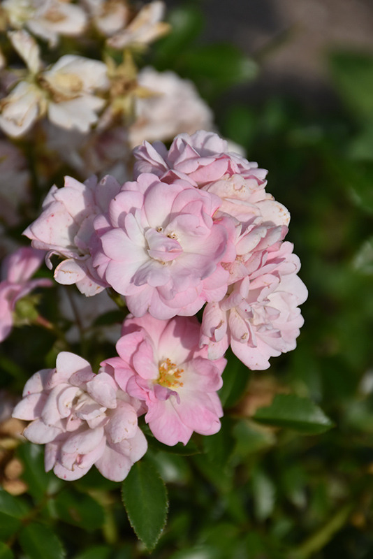 A popular old-fashioned shrub rose, featuring clusters of double light pink flowers all season long; compact and very low-growing, hardy and resistant to disease, makes an excellent flowering groundcover; all roses need full sun and well-drained soil