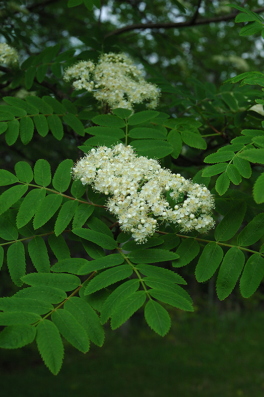 A narrowly oval accent tree with clusters of white flowers in spring followed by bright red berries that persist into winter; compound leaves with silver undersides turn flaming red in fall; ideal for small properties; needs well drained soil