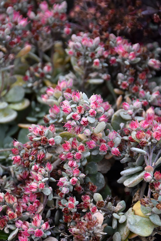 SunSparkler® Blue Elf Sedoro has masses of beautiful clusters of rose flowers at the ends of the stems from late summer to mid fall, which emerge from distinctive red flower buds, and which are most effective when planted in groupings. The flowers are excellent for cutting. Its attractive large succulent round leaves remain bluish-green in color with showy steel blue variegation and tinges of pink throughout the season.