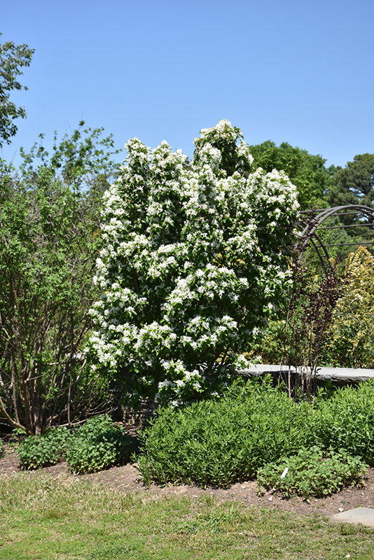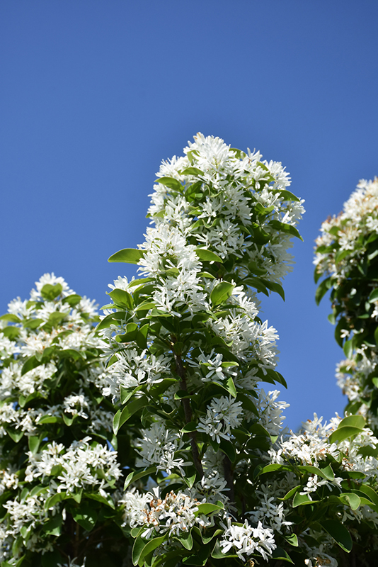 A beautiful, narrow, strongly upright branching tree, presenting frothy panicles of fine white, strap-like flowers above the foliage in spring; attractive berries in fall, and interesting bark for winter value; a wonderful landscape accent