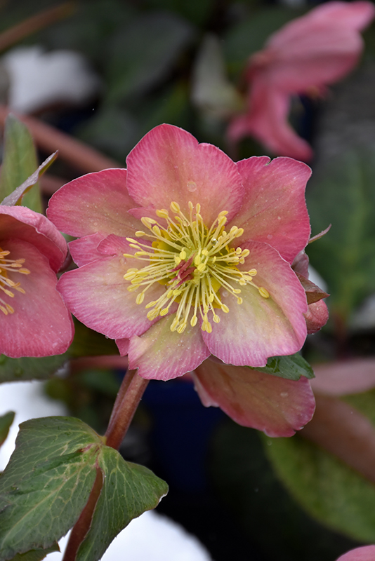 FrostKiss™ Cheryl's Shine® Hellebore features showy nodding pink cup-shaped flowers with peach overtones and chartreuse eyes at the ends of the stems from late winter to early spring. Its attractive serrated oval compound leaves remain dark green in color with distinctive light green veins throughout the year.