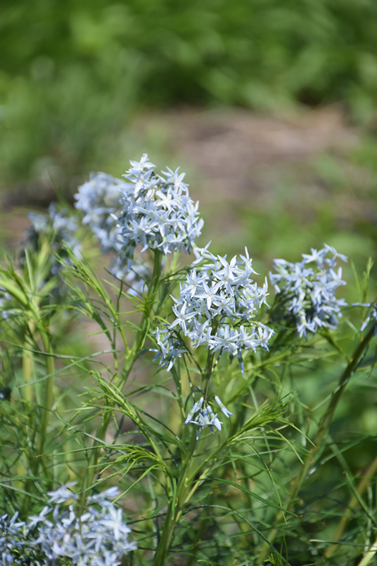 A dense and mounded selection that features narrow, ferny foliage throughout the season; soft blue, star shaped flowers bloom in clusters from late spring to early summer; foliage turns a lovely golden yellow in the fall; easy to grow and low maintenance