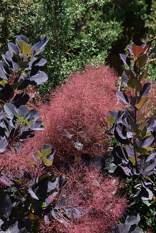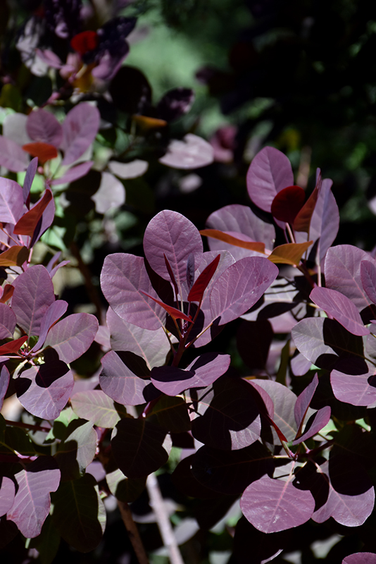 Lilla Smokebush features airy panicles of pink flowers at the ends of the branches from early to late summer. It has attractive deep purple deciduous foliage. The round leaves are highly ornamental and turn outstanding shades of red and orange in the fall.