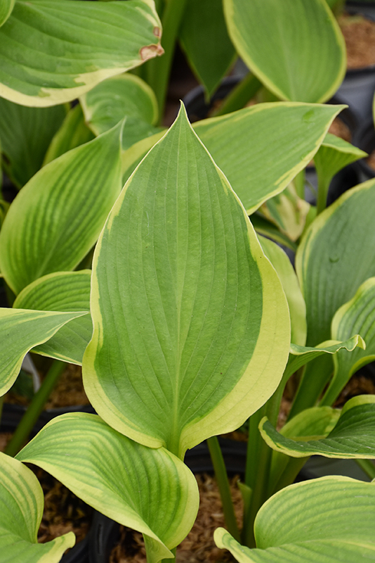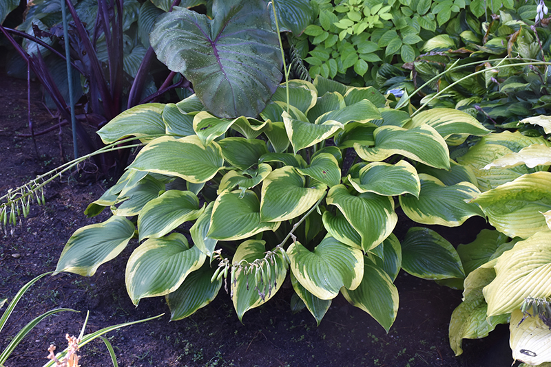 This bold variety features medium green foliage with golden margins; provides outstanding contrast to other plants; pale lavender flowers on tall spikes in mid-summer; a versatile, colorful addition to the garden or landscape